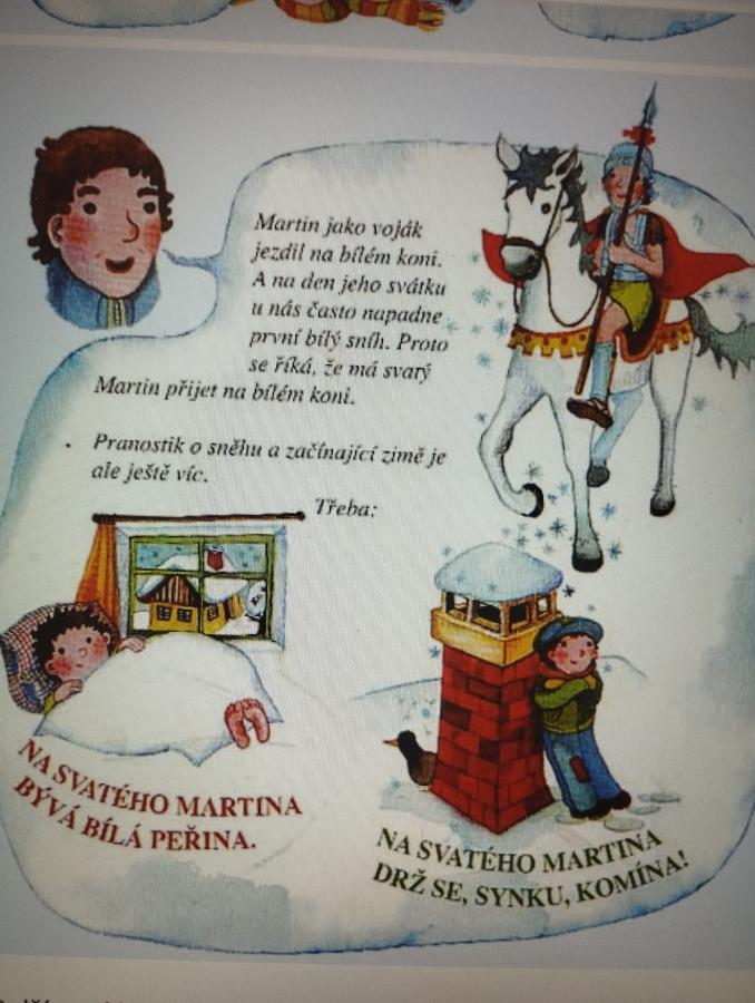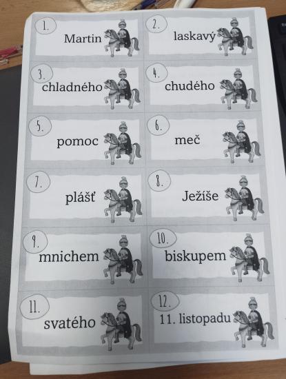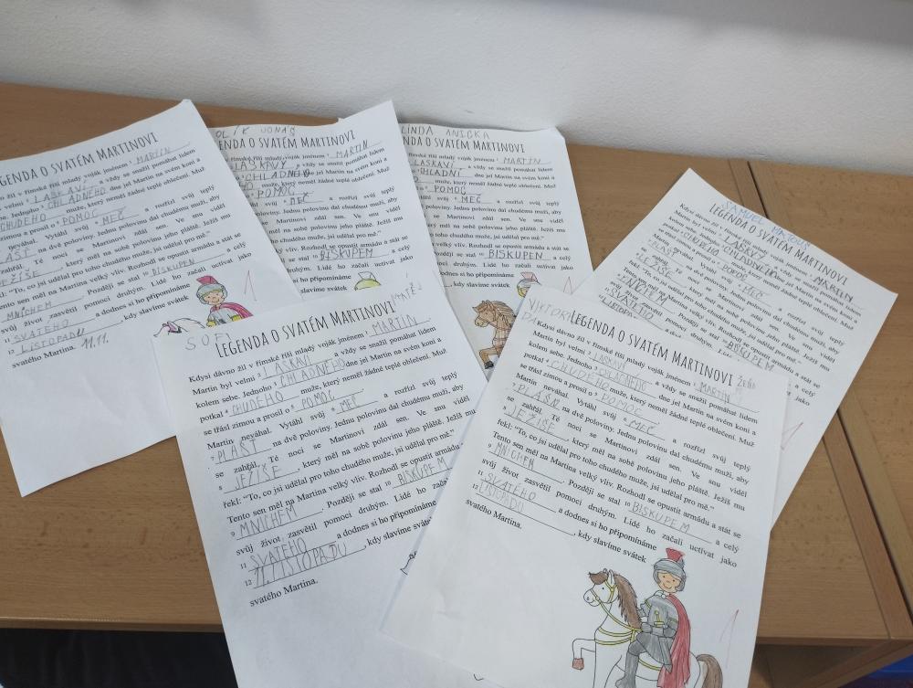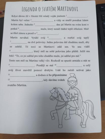 V úterý 11.11. jsme si s radostí užili projektové vyučování - povídali jsme si o sv. Martinovi, seznámili se s legendou o sv. Martinovi, ve dvojicích doplnili pracovní list, zazpívali písničky, přečetli říkadla, pranostiky a v závěru namalovali Martina na bílém koni. Bohužel nám letos na bílém koni nepřijel.